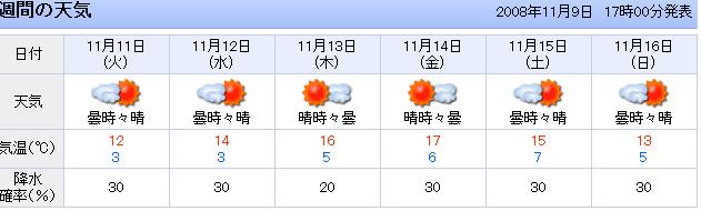 "晴れ時々曇り"、" 最高・最低気温は 13 ~ 05度" と、気持ちいい気候に恵まれる予定です。