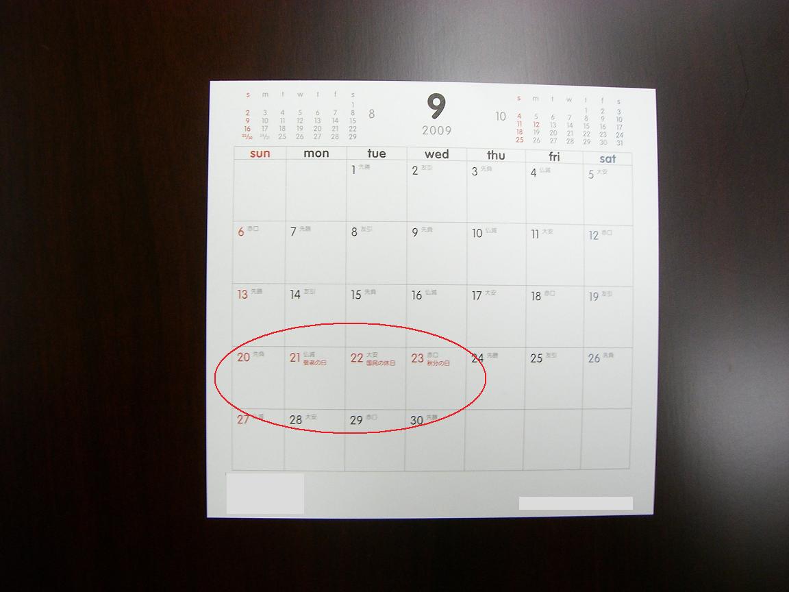 9 / 19 (土)、 9 / 20 (日)、 9 / 21 (敬老の日)、 9 / 22 (国民の休日)、 9 / 23 (秋分の日) の 5連休。