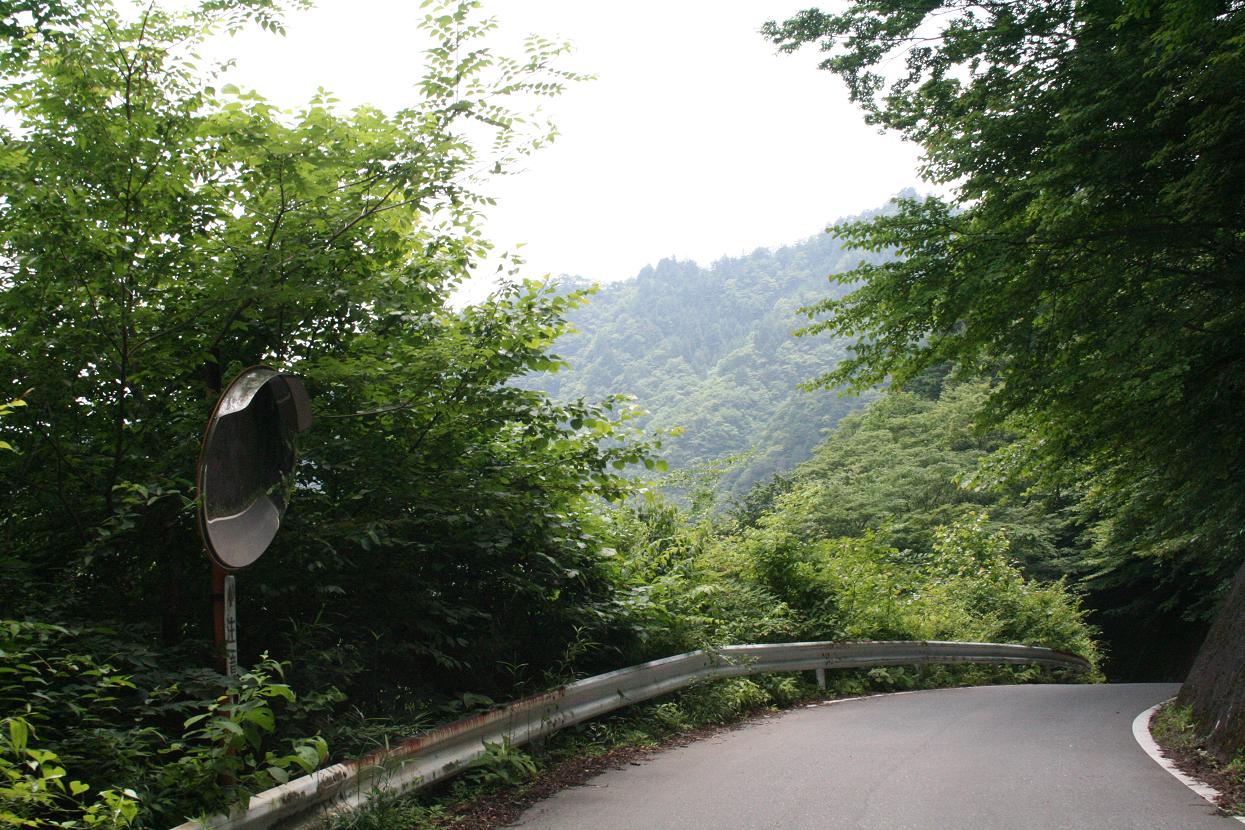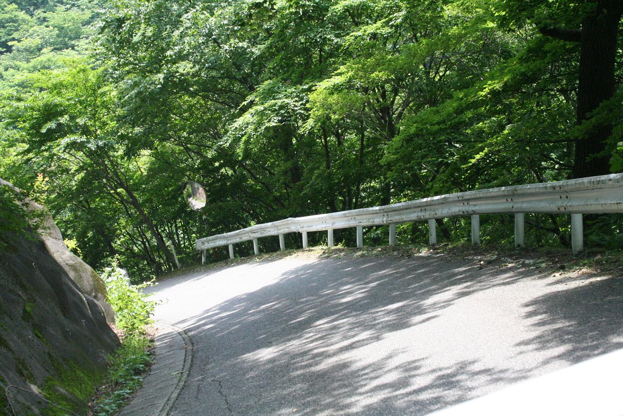 対面通行ですが、新緑が綺麗です。 なによりも通行車両がほとんどないため、「俺の道」状態。