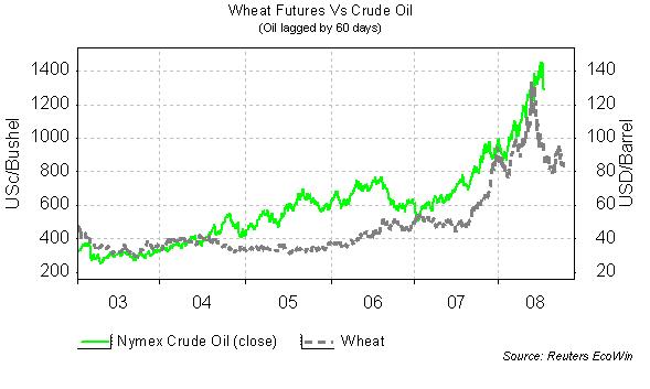 ただ過去のパターンがそのまま当てはまるのであれば、原油先物価格は小麦先物価格に