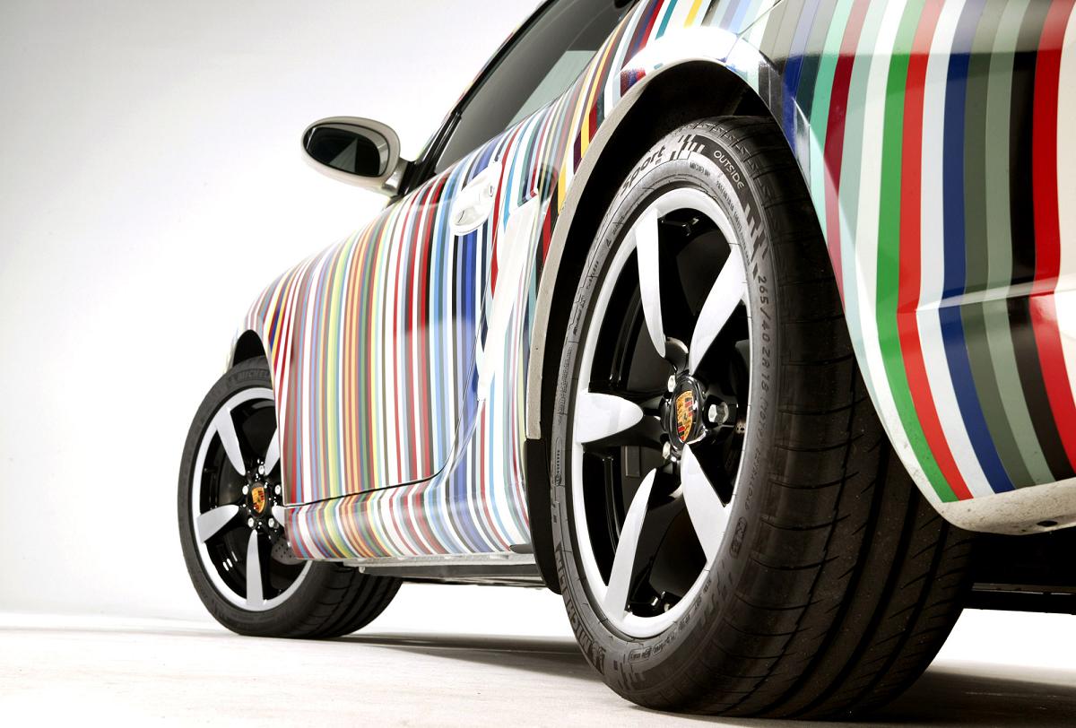 過去 60年間におけるポルシェ車のボディ・カラー全てを、ホワイト・ケイマンにラインで表現。