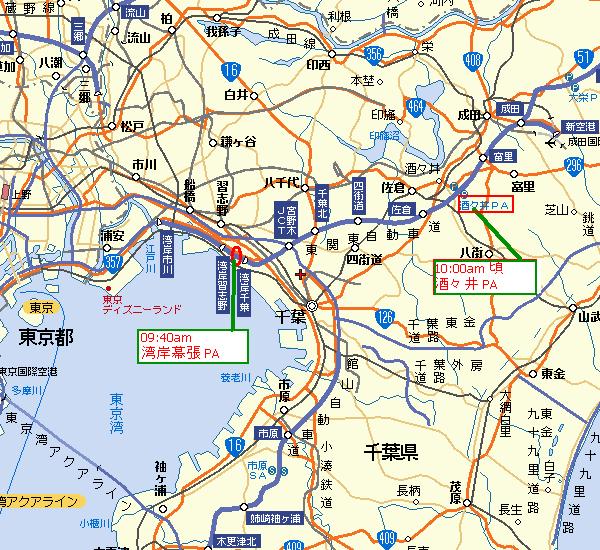 ① 東関東高速道 下り線 湾岸幕張 PA ここを 09:40時に、出発予定