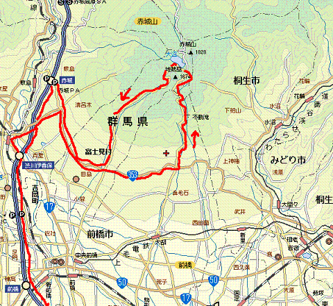 1579mの長七郎山) ⇒ 赤城山頂上 ⇒ 県道 4号 赤城道路を下る ⇒ 県道 353号 ⇒
