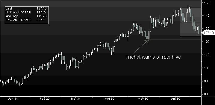 基調が続いていると思われ、恐らくトリシェ欧州中銀総裁が利上げ発言をし、ドルが急落した