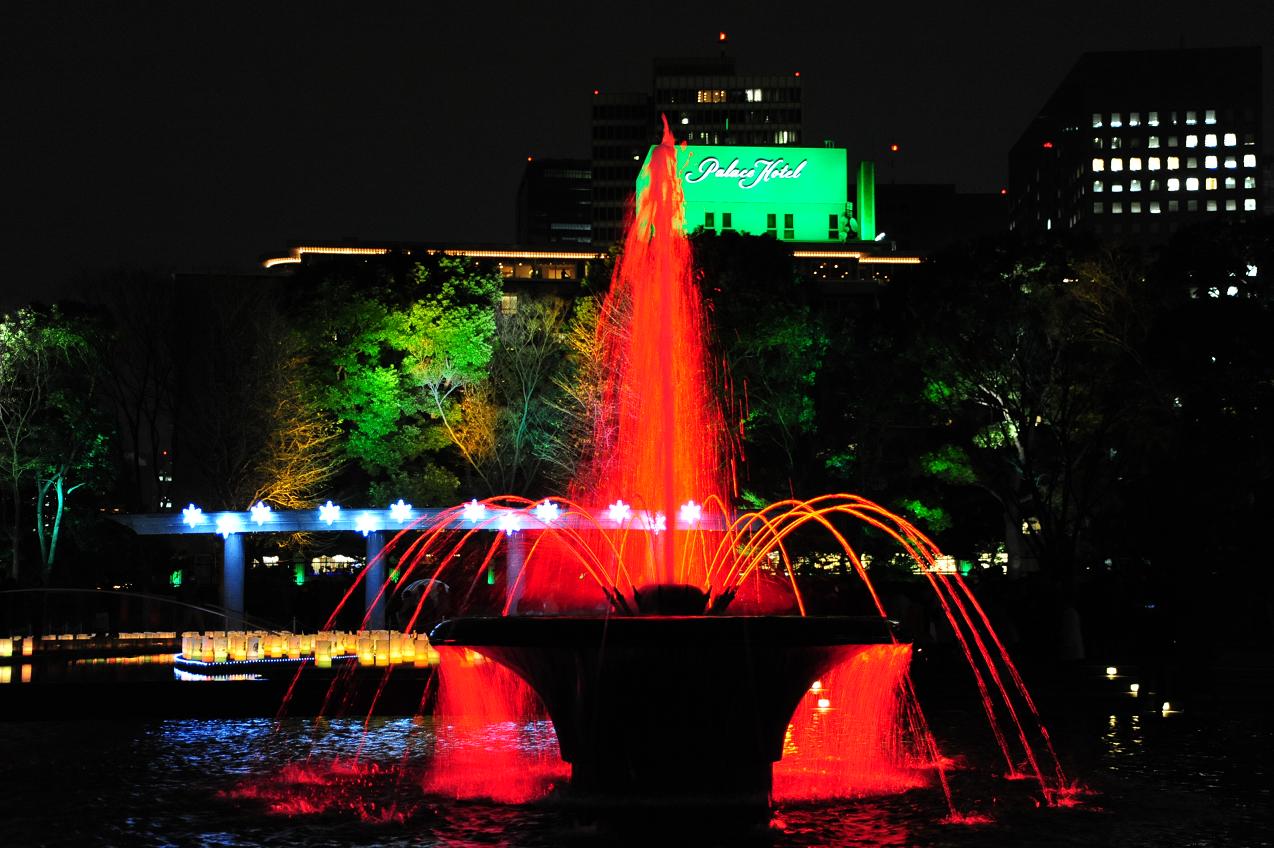 和田倉噴水公園でも、イルミネーションが華やかということで立ち寄ると、噴水が七色に変化しています。